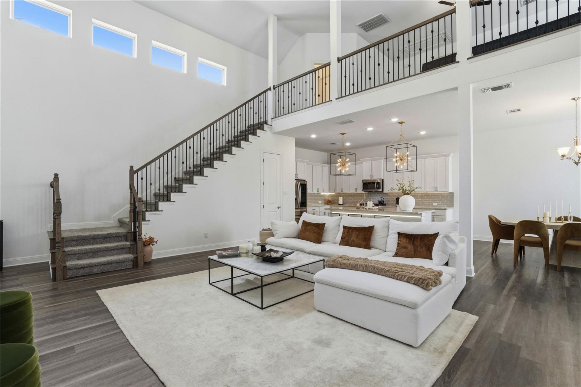 Welcome to this beautifully designed 4-bedroom, 3.5-bath home in the Deerbrooke community, offering 3,297 square feet of thoughtfully curated living space on a corner lot. Built in 2022, this home showcases high ceilings, recessed lighting, and an abundance of windows that flood the space with natural light. The open-concept layout connects the kitchen, dining, and living areas. The kitchen features crisp white cabinetry, stainless steel appliances, a gas stovetop, and a spacious center island with eat-in seating. The primary suite is conveniently located on the main floor and offers a walk-in closet, dual vanity, soaking tub, and walk-in shower. Upstairs, a versatile loft/flex space overlooks the living room below, providing the perfect area for a second living space, office, or playroom. Step outside to enjoy a covered patio with exterior steps leading down to the backyard. The 3-car garage adds both convenience and ample storage. Residents of Deerbrooke enjoy exceptional amenities, including scenic nature trails, a fitness center, infinity-edge pool, splash pad, and dog park. A modern, light-filled home with space to live, work, and unwind?this one checks all the boxes.